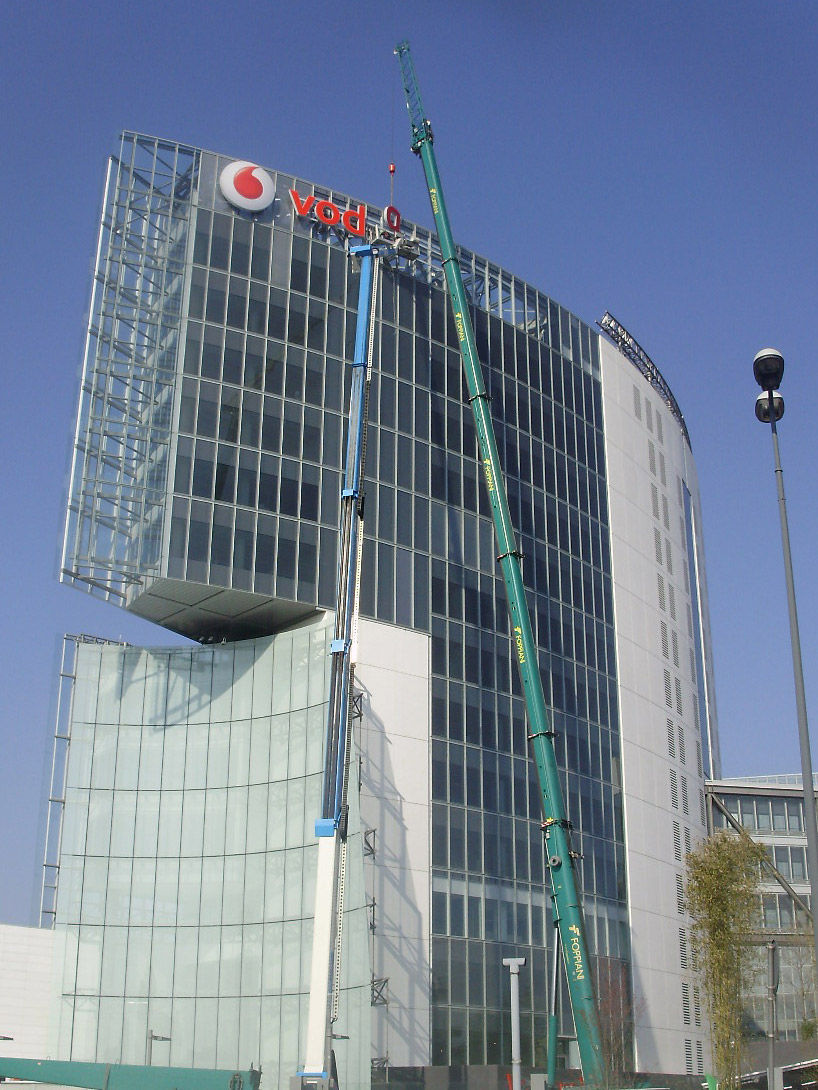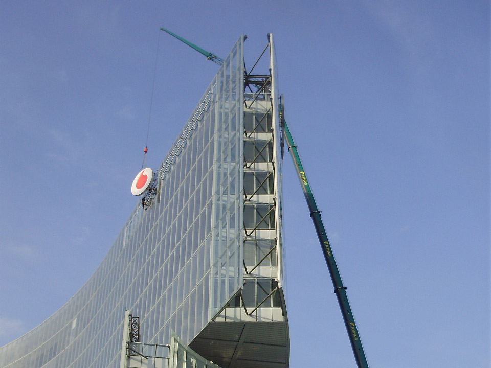 Insegna a lettere scatolate luminose di grandi dimensioni per un progetto di importanza rilevante, installata ad alta quota su grattacielo per mezzo di tecnologie all’avanguardia e personale specializzato “fly man”.