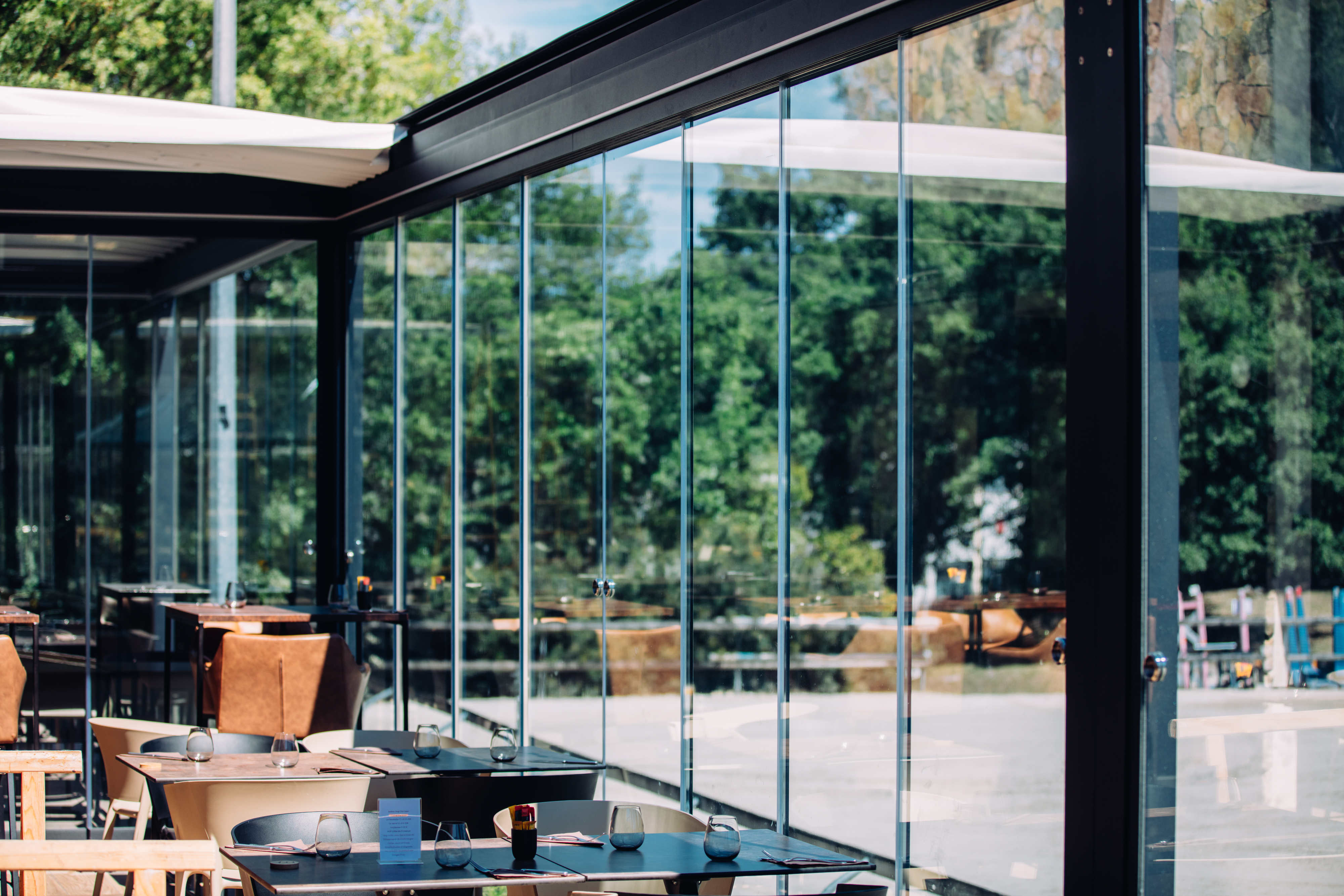 Sunlight può essere integrata con molteplici tipologie di chiusure, vetrate scorrevoli panoramiche Line Glass a 3 vie o con il sistema di tende a rullo verticali Vertika Sunlight.